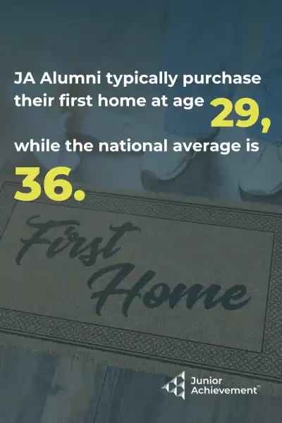 - JA Alumni typically purchase their first home at age 29, while the national average is 36.